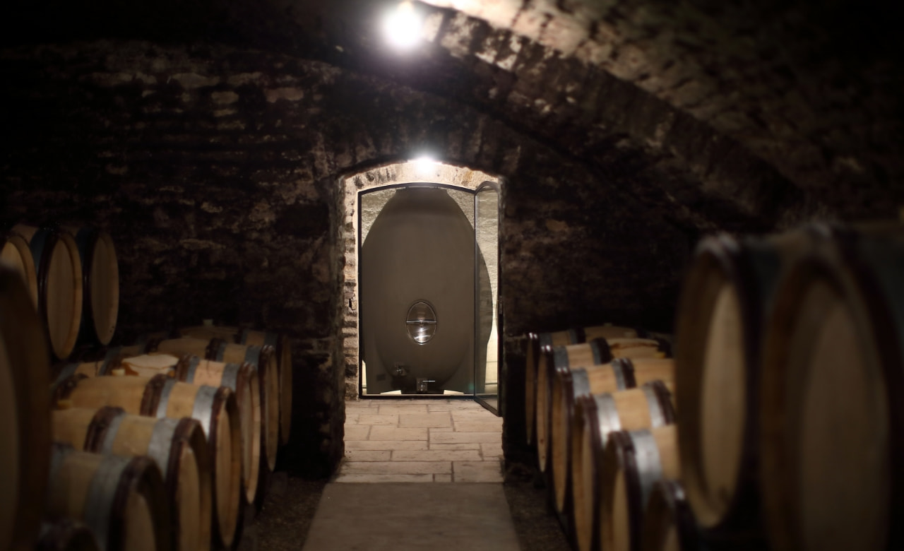 qui magnifie les arômes, affine la tension et les textures du jus. Les vins passent d’abord en fûts de chêne, avec une proportion précise de fûts neufs, pour sublimer la rondeur, sans marquer le vin d’une note boisée prégnante. Puis, les vins blancs évoluent un an dans des œufs béton, qui favorisent le lent mouvement des jus, et leur contact nourricier avec les lies. Les vins rouges bénéficient d’un traitement similaire dans des foudres de grande capacité.